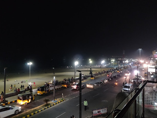 As we headed back by the beach road we came across a bunch of beach facing cafes and lounges. We decided to stop for dinner at Percolator cafe which is by the R K Beach (Do try the outdoor wheel seating in this restaurant). This beach reminded us of Besant Nagar beach of Chennai. That was it for the day.